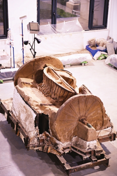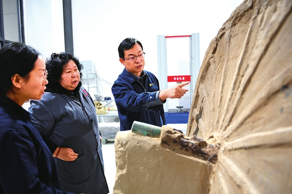 陕西省考古研究院研究馆员孙战伟(右)和同事们在陕西省考古研究院文物保护实验室讨论瓦窑沟墓地出土的双辕车清理修复情况。