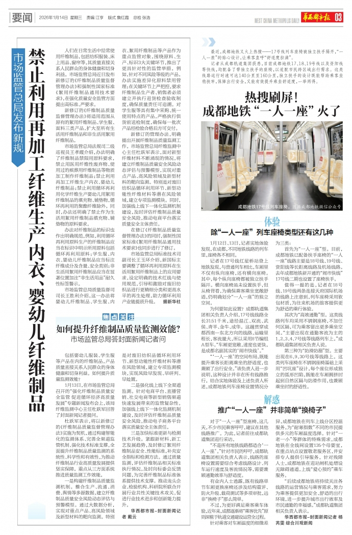 对于“一人一座”型座椅,这几天,不少市民乘客呼吁,建议在其他线路推广。为此,记者前往成都轨道集团进行采访。