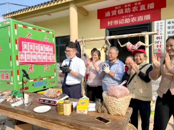 关祖苹(左一)为村民直播带货。