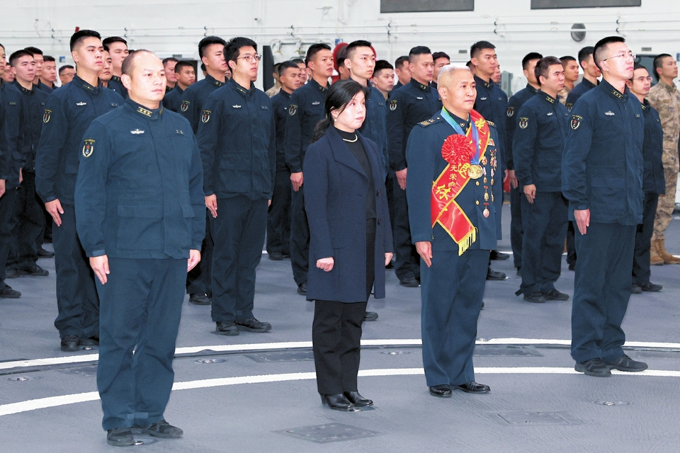 1月7日,海军福建舰为服役已满30年的一级军士长王维举办退役仪式,他的妻子也在现场见证。 新华社发
