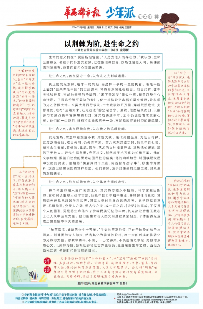 文章论述如何践行“生命的意义”,以“坚守”“燃烧”“成就”为阶梯,层层递进,结构严谨。论据丰富,选取袁隆平、玄奘、鉴真、鲁迅等人物,使论证既有历史厚度,又具文学感染力。全文将“荆棘”的磨砺升华为成长的阶梯,将个人生命价值与时代使命紧密相连,立意高远,气势磅礴,体现了思辨深度与格局担当。