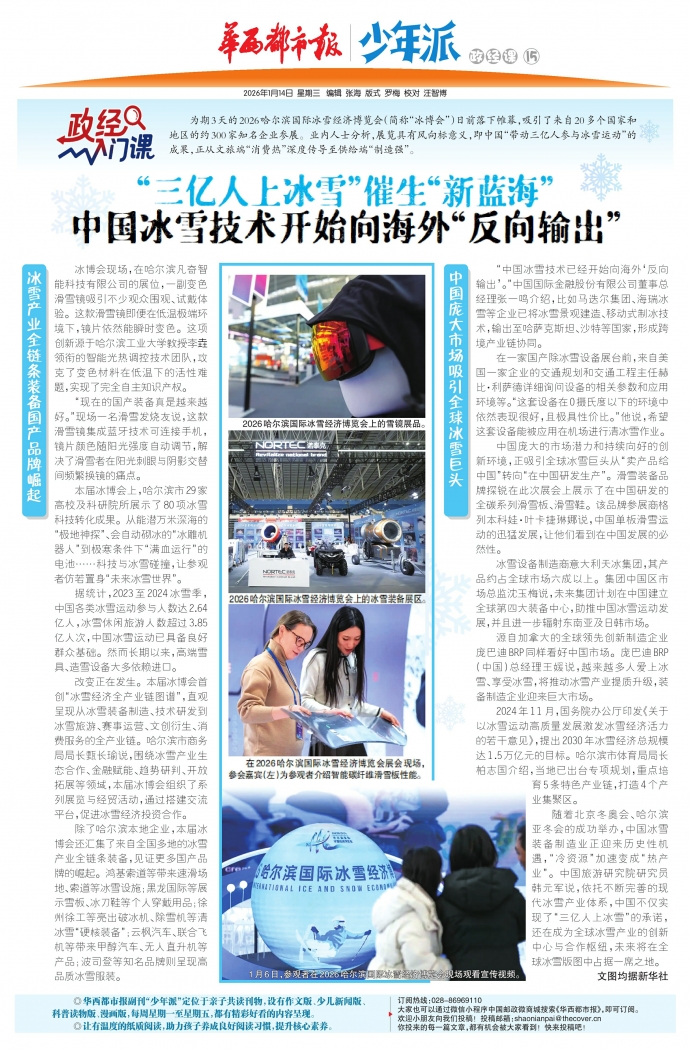 为期3天的2026哈尔滨国际冰雪经济博览会(简称“冰博会”)日前落下帷幕,吸引了来自20多个国家和地区的约300家知名企业参展。业内人士分析,展览具有风向标意义,即中国“带动三亿人参与冰雪运动”的成果,正从文旅端“消费热”深度传导至供给端“制造强”。