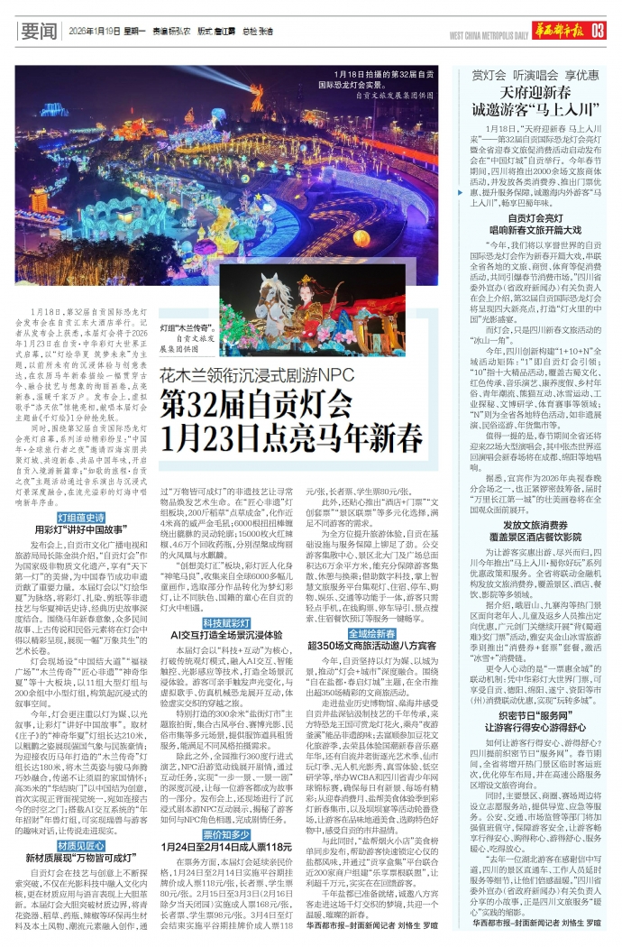 1月18日,“天府迎新春马上入川来”——第32届自贡国际恐龙灯会亮灯暨全省迎春文旅促消费活动启动发布会在“中国灯城”自贡举行。今年春节期间,四川将推出2000余场文旅商体活动,并发放各类消费券、推出门票优惠、提升服务保障,诚邀海内外游客“马上入川”,畅享巴蜀年味。
