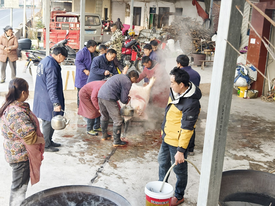 干脆利落地结束这个过程,不仅让猪少遭罪,也是主人家的心愿。“如果一下就把猪杀了,血也流得很顺畅,寓意着主人家来年顺顺利利。”徐利勇说。但他和杜仕福都表示,哪怕血液残留在猪的体内,大家也会说吉利话,“这是主人家的‘内财’”。