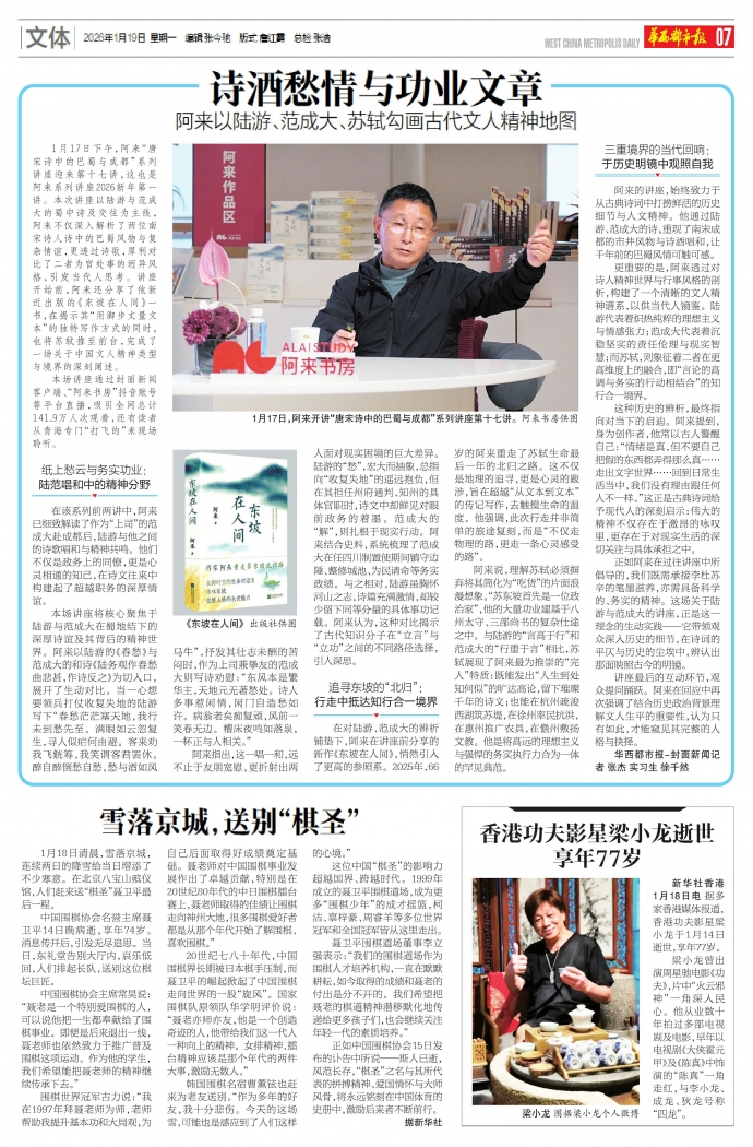 1月17日下午,阿来“唐宋诗中的巴蜀与成都”系列讲座迎来第十七讲,这也是阿来系列讲座2026新年第一讲。本次讲座以陆游与范成大的蜀中诗及交往为主线,阿来不仅深入解析了两位南宋诗人诗中的巴蜀风物与复杂情谊,更透过诗歌,犀利对比了二者为官处事的迥异风格,引发当代人思考。讲座开始前,阿来还分享了他新近出版的《东坡在人间》一书,在揭示其“用脚步丈量文本”的独特写作方式的同时,也将苏轼推至前台,完成了一场关于中国文人精神类型与境界的深刻阐述。