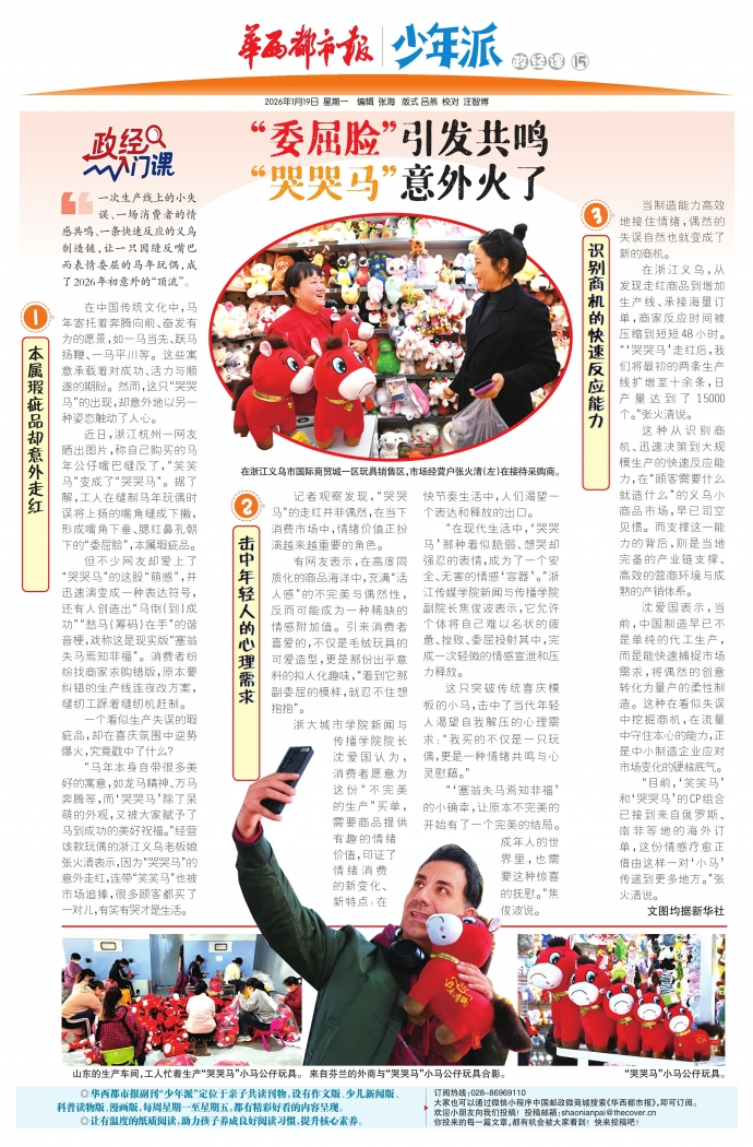 一次生产线上的小失误、一场消费者的情感共鸣、一条快速反应的义乌制造链,让一只因缝反嘴巴而表情委屈的马年玩偶,成了2026年初意外的“顶流”。