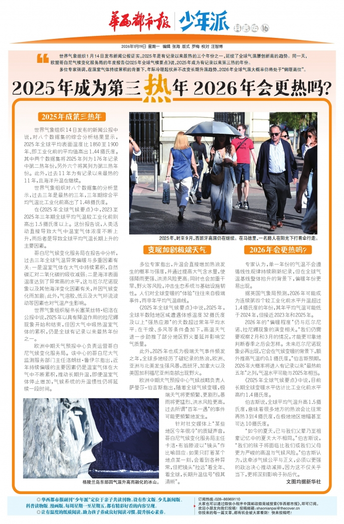 世界气象组织1月14日发布新闻公报证实,2025年是有记录以来最热的三个年份之一,延续了全球气温屡创新高的趋势。同一天,欧盟哥白尼气候变化服务局的年度报告《2025年全球气候要点》说,2025年成为有记录以来第三热的年份。
