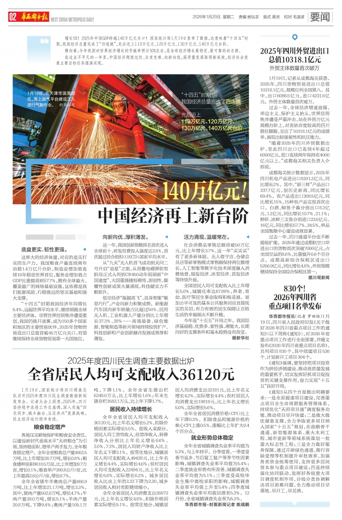 1月19日,国家统计局四川调查总队召开2025年度四川民生调查数据新闻发布会。记者从会上获悉,2025年,四川坚持稳中求进工作总基调,深入实施“四化同步、城乡融合、五区共兴”发展战略,民生经济运行稳中有进。