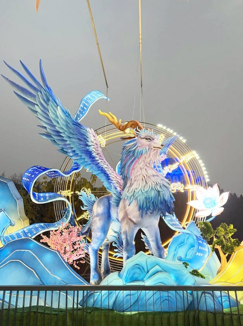 最终,200多斤稻草在彩灯工匠的巧手下,变成了一只雄赳赳气昂昂的金毛犼,一堆10立方米的泡沫变成了一只插着翅膀昂首欲飞的白泽,6000多根扭扭棒被扭成了一只金光闪闪的貔貅。