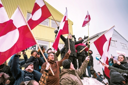 1月17日,在丹麦自治领地格陵兰岛首府努克,格陵兰岛自治政府总理延斯-弗雷德里克·尼尔森(中)与当地民众参加示威游行。新华社发