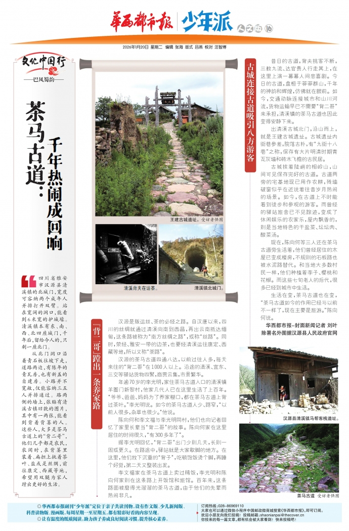 昔日的古道,背夫挑客不断,三教九流、达官贵人行走其上,在这里上演一幕幕人间悲喜剧。今日的古道,盘桓于莽莽群山,千年的神韵和辉煌,仿佛就在眼前。如今,交通动脉连接城市和山川河流,货物运输早已不需要“背二哥”来承担,清溪镇的茶马古道也因此变得安静下来。