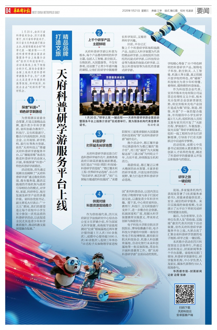 1月20日,由四川省科学技术协会、四川省教育厅、四川省科学技术厅、四川省文化和旅游厅联合主办,封面传媒承办的“研学之旅 一键启程——天府科普研学游全面启动暨服务平台上线推介活动”在四川科技馆举行。活动采取线上线下相结合的方式,面向全省推介全新上线的天府科普研学游服务平台,为广大群众尤其是青少年提供到高等院校、科研院所、科技企业去“玩转科学”的好机会。1