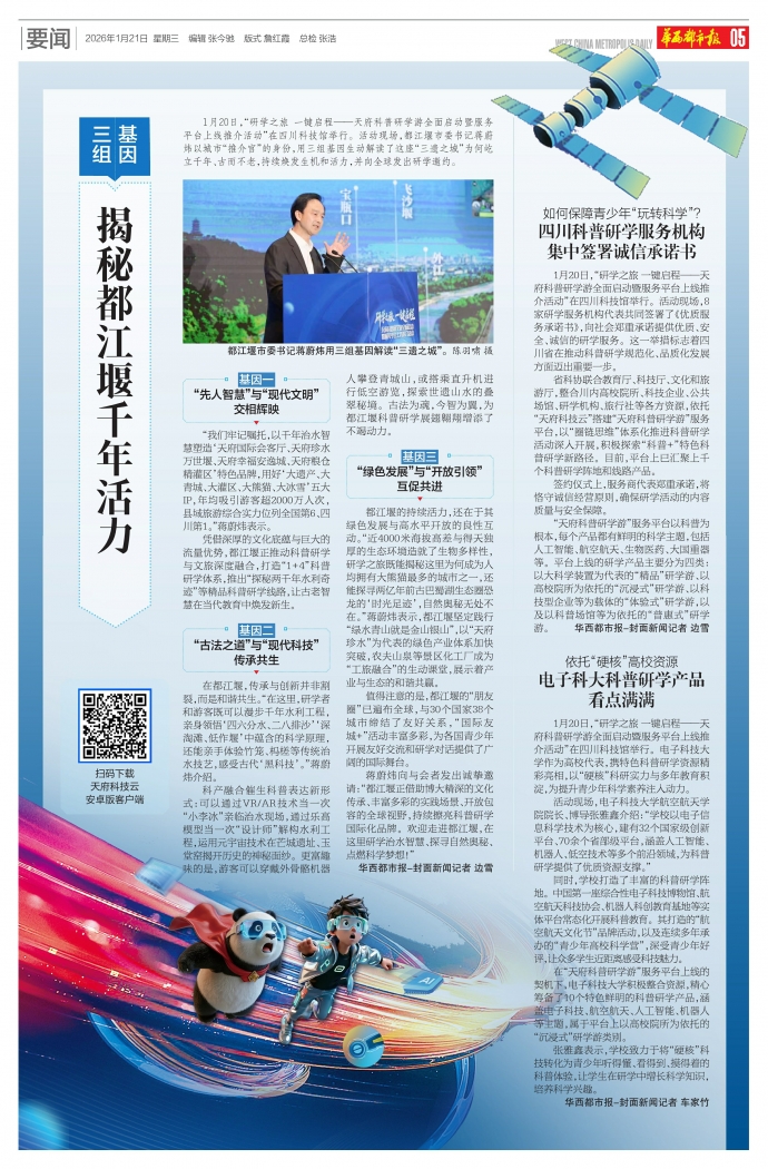 省科协联合教育厅、科技厅、文化和旅游厅,整合川内高校院所、科技企业、公共场馆、研学机构、旅行社等各方资源,依托“天府科技云”搭建“天府科普研学游”服务平台,以“圈链思维”体系化推进科普研学活动深入开展,积极探索“科普+”特色科普研学新路径。目前,平台上已汇聚上千个科普研学阵地和线路产品。