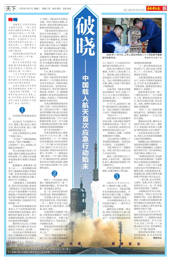 2025年11月9日,工作人员在对神舟二十二号的供气管路进行吹除作业。 图据新华社客户端