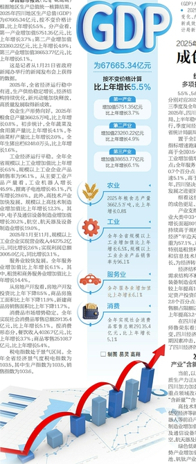 1月21日,2025年四川经济“成绩单”揭晓——2025年四川地区生产总值(GDP)为67665.34亿元,按不变价格计算,比上年增长5.5%。