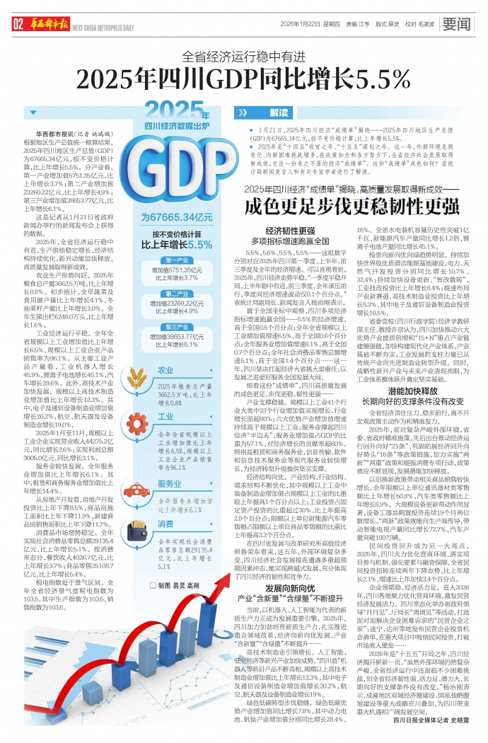 5.5%、5.6%、5.5%、5.5%——这组数字分别对应2025年四川第一季度、上半年、前三季度及全年的经济增速。可以直观看到,2025年,四川经济走势平稳。“一季度平稳开局,上半年稳中有进,前三季度、全年承压前行,季度间经济增速波动仅0.1个百分点。”省统计局副局长、新闻发言人杨治刚表示。