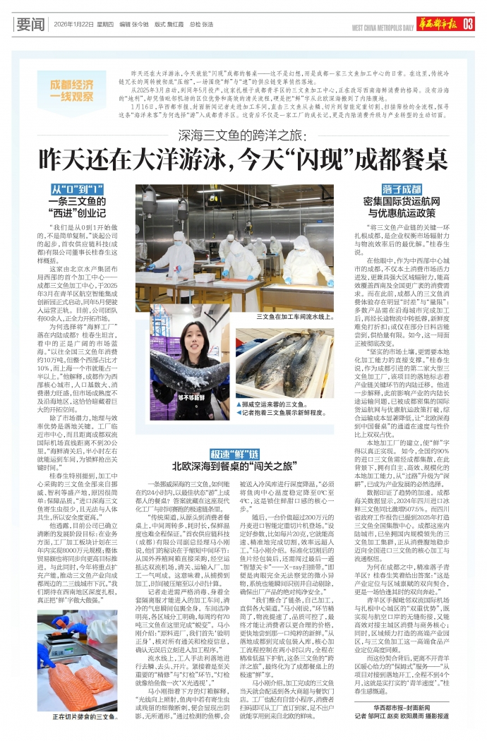 1月16日,华西都市报、封面新闻记者走进加工车间,直击三文鱼从去鳞、切片到智能定重切割、扫描筛检的全流程,探寻这条“海洋来客”为何选择“游”入成都青羊区。这背后不仅是一家工厂的成长记,更是内陆消费升级与产业转型的生动切面。
