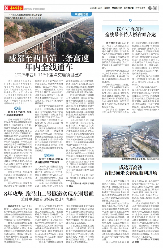 华西都市报讯(记者 曹菲)1月20日,G5京昆高速公路汉中至广元段(四川境)高速公路扩容项目(以下简称“汉广扩容项目”)取得关键进展——全线最长特大桥新桥坝特大桥右幅合龙。大桥主体结构实现基本贯通,为汉广扩容项目全线通车按下“加速键”。
