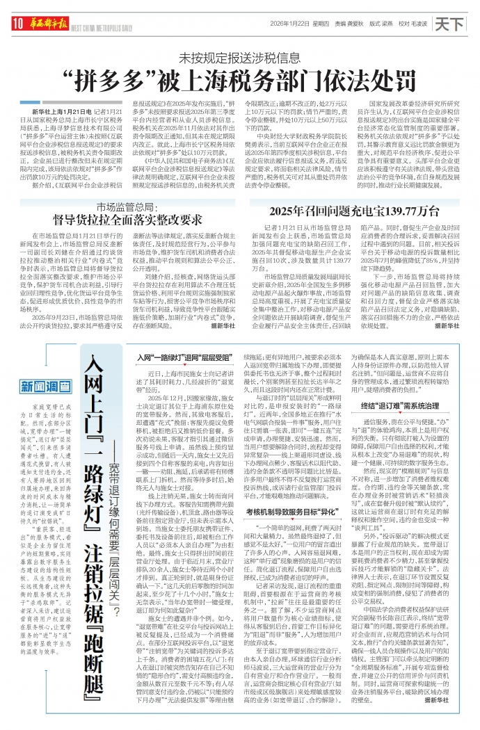 记者1月21日从市场监管总局新闻发布会上获悉,市场监管总局加强问题充电宝的缺陷召回工作,2025年共督促移动电源生产企业实施召回10次,涉及数量共计139.77万台。