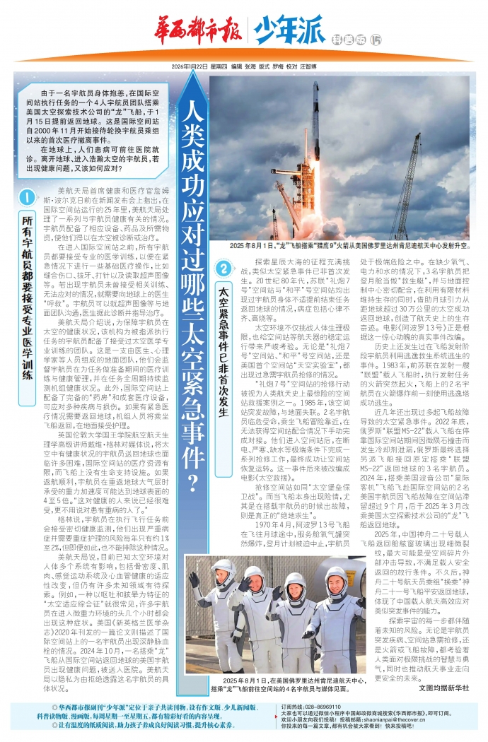 探索宇宙的每一步都伴随着未知的风险。无论是宇航员突发疾病、空间站急需抢修,还是火箭或飞船故障,都考验着人类面对极限挑战的智慧与勇气,同时也推动航天事业走向更安全的未来。文图均据新华社