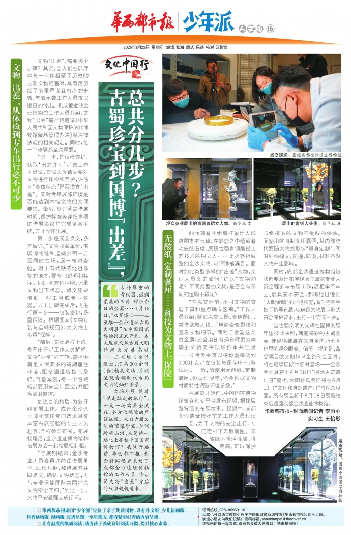 文物外展,绝非“说走就走的旅行”,而是一场需要全流程、全方位保障的严谨征程。来自古蜀文明的璀璨珍宝,如何跨越山河,从蜀地一路北上亮相中国国家博物馆?展览开启前,华西都市报、封面新闻记者采访了成都金沙遗址博物馆的工作人员,将古蜀文物“出差”背后的故事娓娓道来。