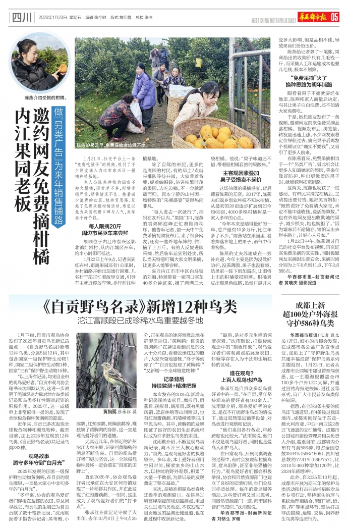 1月下旬,自贡市观鸟协会发布了2025年自贡鸟类新记录盘点——《自贡野鸟名录》新增12种鸟类,分属5目12科,其中包含国家一级保护野生动物1种、国家二级保护野生动物1种、国家“三有”保护野生动物10种。