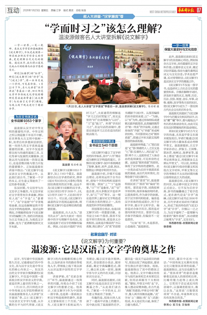 1月22日,四川师范大学中华传统文化学院特聘研究员温浚源做客名人大讲堂“汉字源流”季,以《〈说文解字〉与汉语言文字学》为题,从许慎的生平与时代背景、《说文解字》的内容概略和核心特色,以及研读本书的路径等视角入手,带领线上线下观众深入认识这部开创性的文字学经典。