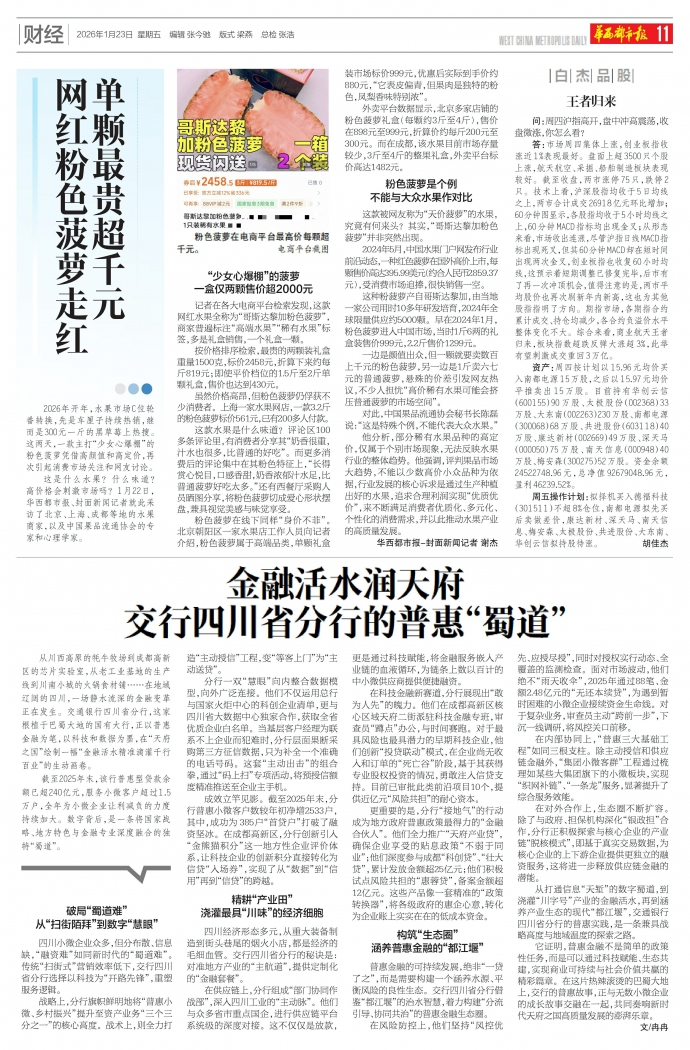 从川西高原的牦牛牧场到成都高新区的芯片实验室,从老工业基地的生产线到川南小城的火锅食材铺……在地域辽阔的四川,一场静水流深的金融变革正在发生。交通银行四川省分行,这家根植于巴蜀大地的国有大行,正以普惠金融为笔,以科技和数据为墨,在“天府之国”绘制一幅“金融活水精准滴灌千行百业”的生动画卷。