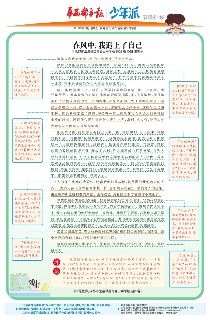这篇随笔最动人处,是少年视角里的真实与赤诚。小作者笔下的“求名求利”,不是成人世界的功利,而是初中生怕辜负期待、怕输得难堪的朴素心事,直白又珍贵。全文以一张赛场照片串起奔跑全程,心理刻画细腻,比喻鲜活有张力,更在最后冲刺的相互超越中,完成从“在意评价”到“正视自我”的成长,字里行间满是青春的倔强与清醒,是一篇有真情、有思考的佳作。