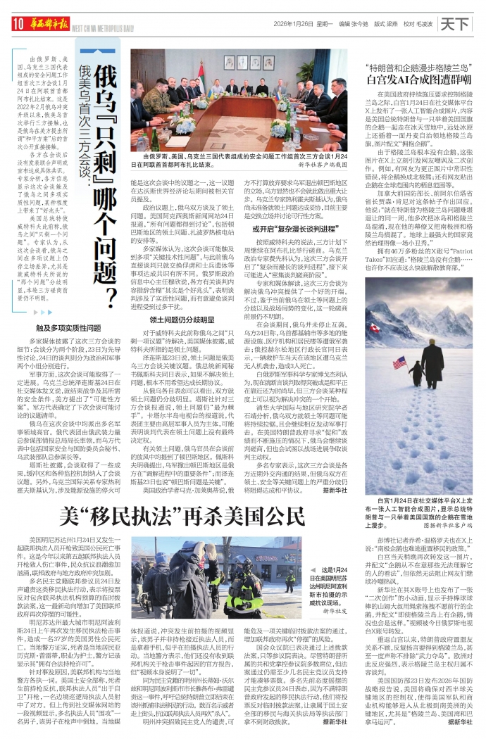 在美国政府持续施压要求控制格陵兰岛之际,白宫1月24日在社交媒体平台X上发布了一张人工智能合成图片,内容是美国总统特朗普与一只举着美国国旗的企鹅一起走在冰天雪地中,远处冰原上还插着一面丹麦自治领地格陵兰岛旗,图片配文“拥抱企鹅”。
