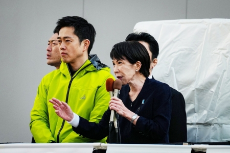 1月27日,日本首相、自民党总裁高市早苗(前右)、维新会党首吉村洋文(前左)在东京秋叶原车站附近出席街头演讲活动。 新华社发