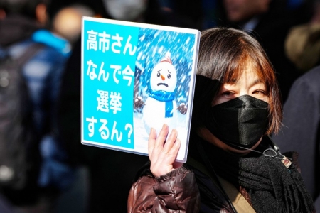 1月27日,在高市早苗的街头演讲活动中,民众举起抗议标志。新华社发