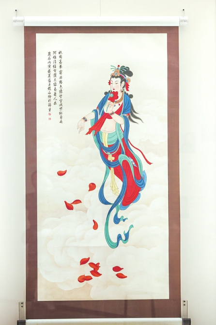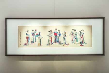 而从展板展示的文字中,可以看到赵蕴玉继承国画技法而自出新意,功力深厚,造诣精湛。他师承张大千,工笔、写意、重彩、白描无不精熟,人物、花鸟、山水均多佳构。尤工仕女,其构图简练,寥寥数笔,妙趣横生,清妍雅丽,卓然成家。赵蕴玉亦工于诗词,长于书法,谙习各体,均称上乘。