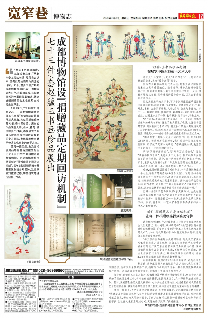 作为四川籍书画家的代表人物,赵蕴玉在中国现代美术史上具有重要地位。隆冬时节,漫步成都博物馆的展厅中,就能看到赵蕴玉笔下尽显婉丽雅致的仕女图、清雅简远的花鸟画、笔骨遒劲的蜀中山水画,以及含蓄秀丽的书法作品……