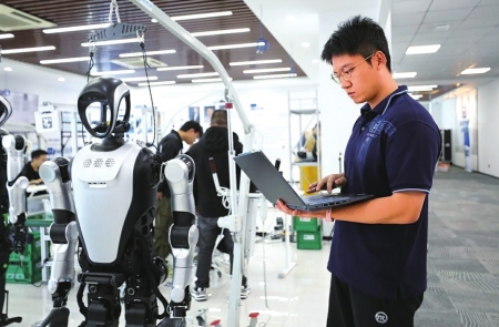 2025年10月24日,机器人应用开发工程师张鸿伟在电脑上查看人形机器人的测试运行数据。