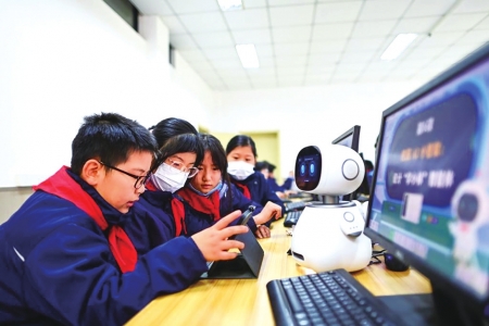 2025年12月5日,杭州市钱塘区学林小学的学生在人工智能通识课上对人工智能机器人进行编程。