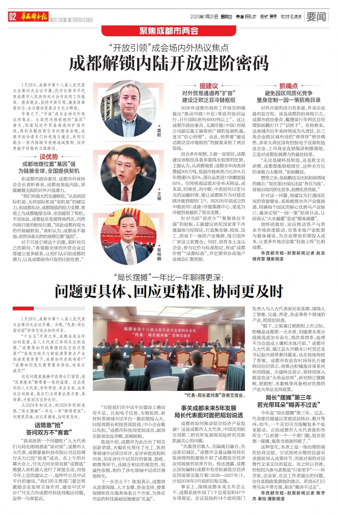 号角之下,“开放”成为会场内外热议的焦点。从深挖内陆枢纽的“基因”潜力,到谋划对外贸易通道的扩容升级,再到求解招商引资的精准命题,成都市政协委员们的视角与建言,共同勾勒出一座内陆城市突破地域限制、向世界敞开怀抱的立体路径。