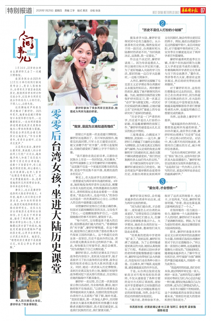 事实上,这正是廖妤轩选择到大陆求学的意义。4年前,她考入四川师范大学历史系,如今本科即将毕业,她坚定地选择继续在大陆攻读研究生。这位立志回台湾做历史老师的女孩相信,自己成长于两岸家庭,接受了两岸教育,既了解台湾学生的心态,又真正触摸过历史留下的痕迹,她能用更缜密的逻辑和严谨的历史观,让更多台湾学生认识真正的历史。她坚信,“理想的历史课堂不是割裂记忆,而是让学生学会理解。”