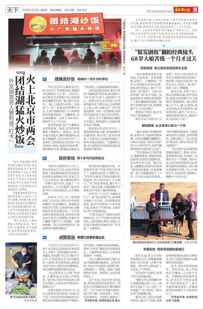 “去年,团结湖猛火炒饭的视频火爆社交网络,我也凑热闹去看看,到了地方发现已经排起了长队,大家都是慕名而来,为了尝尝老板的手艺。”1月25日,北京市两会现场,市人大代表、外交部新闻发言人毛宁在朝阳区代表团会议上点赞说。