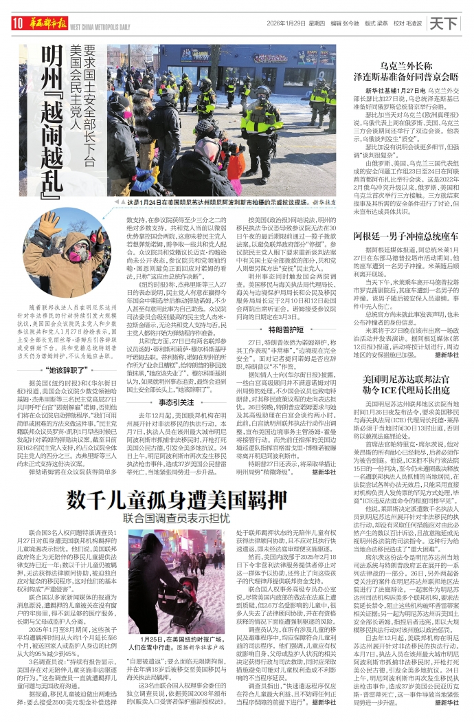 按美国《政治报》网站说法,明州的移民执法争议恐导致参议院无法在30日午夜的最后期限前通过一揽子拨款法案,以避免联邦政府部分“停摆”。参议院民主党人眼下要求重新谈判法案中有关国土安全部拨款的部分,共和党人则想另谋方法“安抚”民主党人。