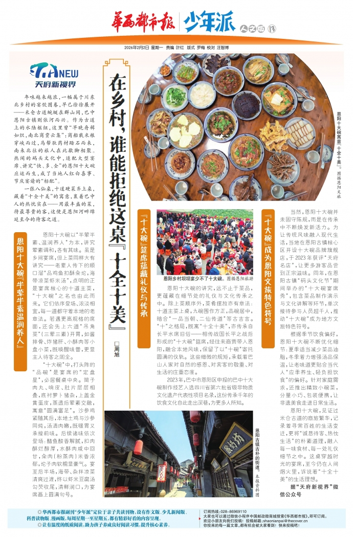 恩阳十大碗,见证过米仓古道的商旅繁华,记录着寻常百姓的生活变迁,更将“诚恳待客、热忱生活”的朴素道理,融入每一味食材、每一处礼仪细节之中。这桌穿越时光的宴席,至今仍在人间烟火里,诉说着“十全十美”的生活理想。