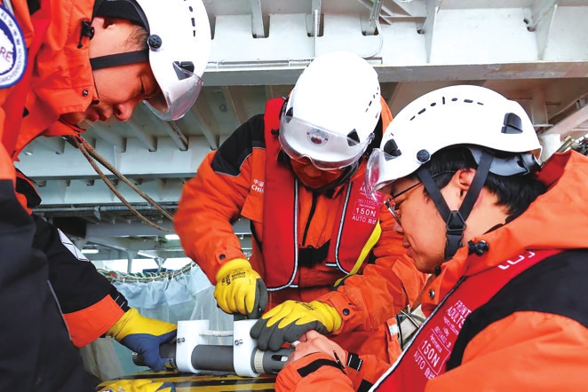 船时2026年1月26日凌晨,“雪龙”号大洋队队员曾定勇(中)与队友韩哲一(右)、宋德海正在连接潜标上的观测仪器。