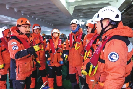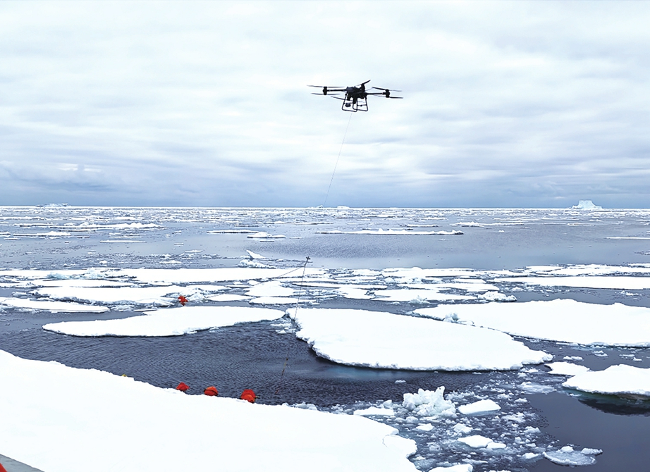 船时1月25日4时许。“抓住了!”随着一声惊呼,无人机抛下的锚钩成功捕获“锚碇式潜标观测系统”(俗称潜标)缆绳。“雪龙”号上的考察队员们应声齐聚船尾,像拔河一样将沉重的浮球组拉上甲板。