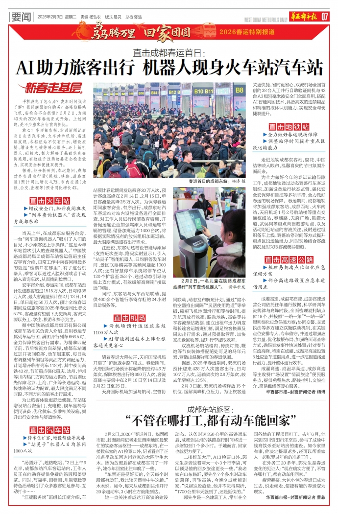 放心!华西都市报、封面新闻记者当日走访汽车站、火车站和机场、高速路发现,各枢纽站不仅有开水、增设座椅、增设充电桩等暖心服务,还上新机器人、AI技术,极大解决了基础信息查询难题,有效提升违禁物品安全检查能力,实现安全和便捷双提升。