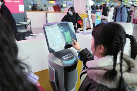 当天上午,在成都东站服务台旁,一台“列车查询机器人”吸引了人们的目光,不少乘客还上手操作。“这是今年车站首次引入的查询机器人。”中国铁路成都局集团成都车站客运值班主任安宇宵介绍,日常工作中乘客问得最多的就是“检票口在哪里”,有了这台机器人,乘客可以通过人脸识别或者手动输入查询车次,从而找到检票口。