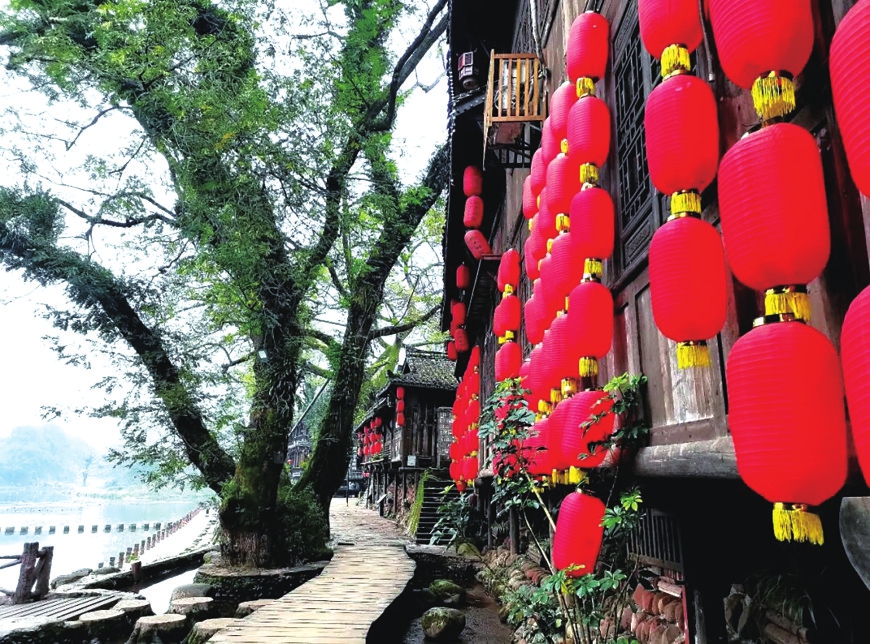 镇中古树参天,黄葛树、桢楠、香樟动辄数百年树龄,根系盘绕老宅墙基,枝叶覆顶成荫。虽说靠山吃山,但当地人从不轻易伐木。人们建房所用的杉梁、竹篾、青瓦,皆取自十里之内,且讲究“轮山歇砍”——今年伐东坡,明年取西岭,山林自有喘息之 机。正因林茂水清,吊脚楼才敢大胆探出木柱,悬于河岸之上。