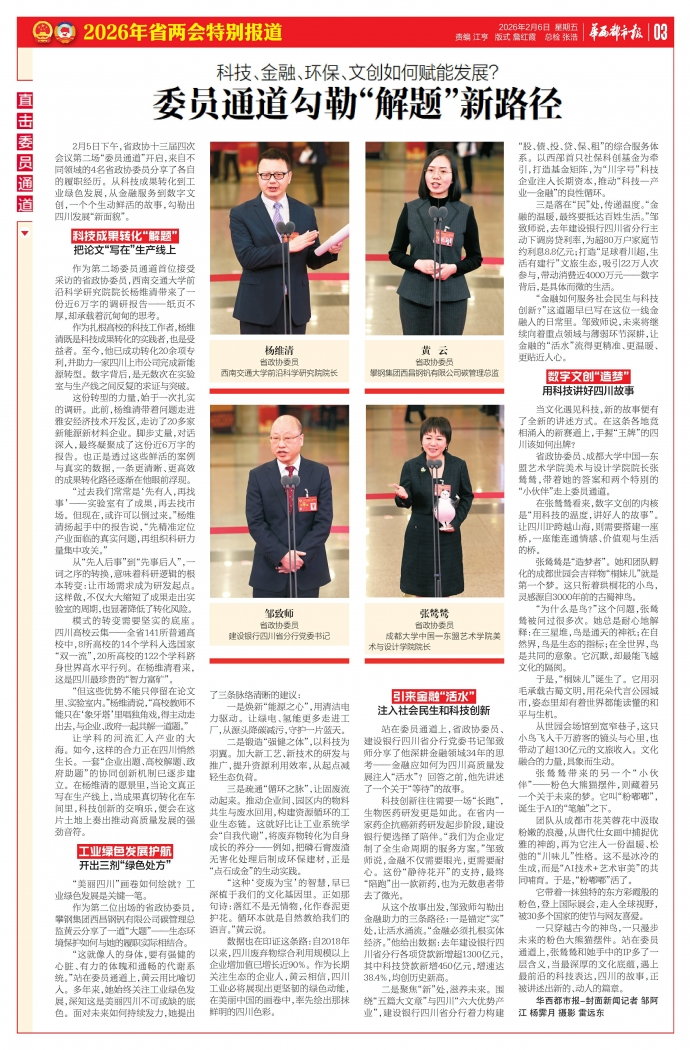 2月5日下午,省政协十三届四次会议第二场“委员通道”开启,来自不同领域的4名省政协委员分享了各自的履职经历。从科技成果转化到工业绿色发展,从金融服务到数字文创,一个个生动鲜活的故事,勾勒出四川发展“新面貌”。