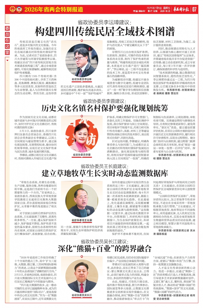 2月3日,省政协委员、四川省侨界妇女委员会首届会长、香港四川社团总会常务副会长李蓉建议,以国土空间规划与建设管理为抓手,通过强化规划统筹、完善管控标准、健全协同机制等举措,实现历史文化保护传承与民生改善、城乡发展同频共振。