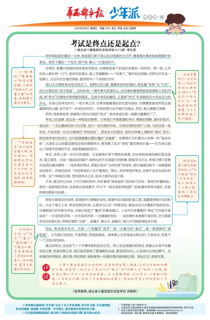 文章开篇场景描写生动传神,迅速将读者带入情境;运用历史典故和精妙比喻,层层深入地论证了考试作为“起点”和“诊断工具”的核心价值;最终将主题升华至人生成长的高度。全文逻辑清晰,论证有力,比喻贴切新颖,引用画龙点睛,体现了作者敏锐的观察力、深刻的思考力和优秀的文字表达能力。