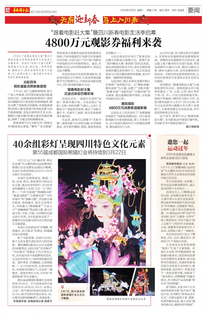 活动期间,“跟着电影赶大集”公益放映周同步启动。放映范围从四川延伸至重庆、广东、云南、江西、浙江等多个省(区、市),计划公益放映超百场。放映片单涵盖口碑佳作与新片力作,包括《捕风追影》《人生开门红》《白蛇:浮生》《走走停停》《雄狮少年2》等十余部影片,丰富各地群众尤其是县域、乡村居民的新春文化生活。